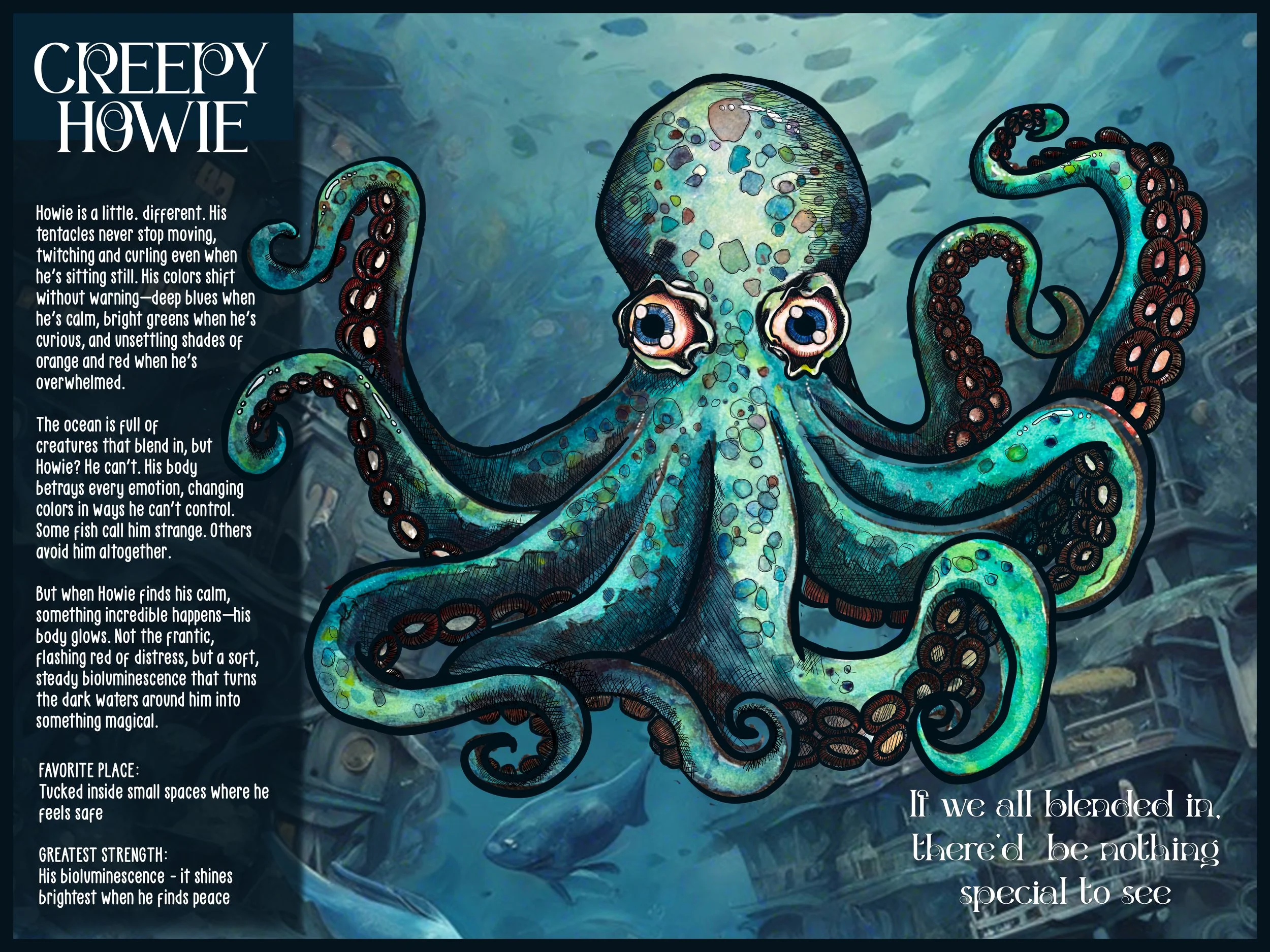 Howie is a little… different. His tentacles never stop moving, twitching and curling even when he’s sitting still. His colors shift without warning—deep blues when he’s calm, bright greens when he’s curious, and unsettling shades of orange and red when he’s overwhelmed.