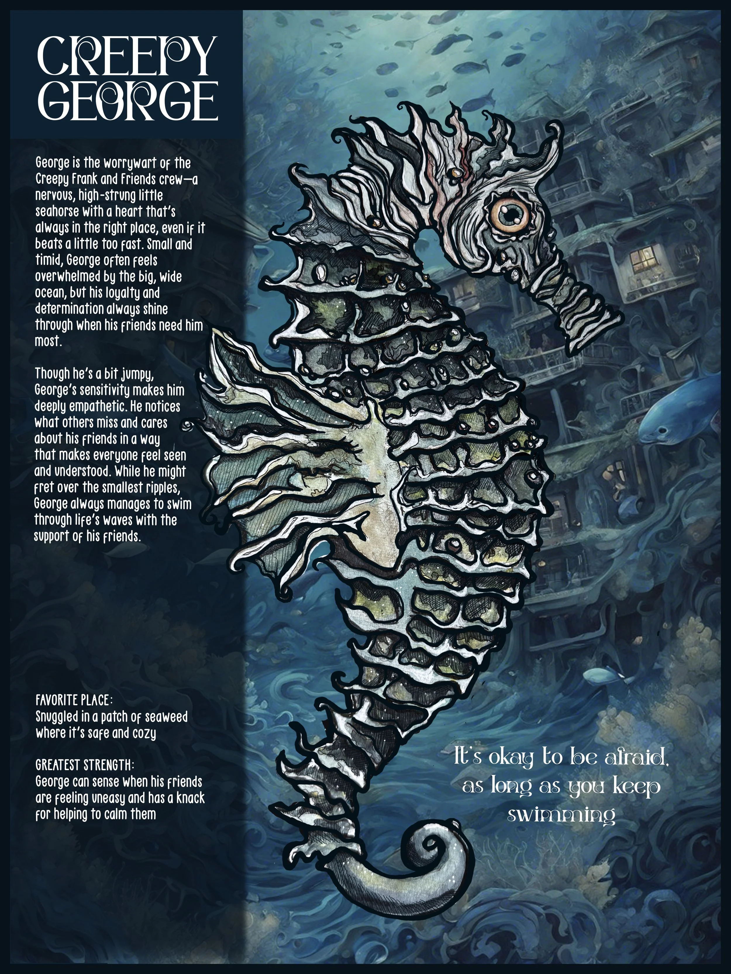 George is the worrywart of the Creepy Frank and Friends crew—a nervous, high-strung little seahorse with a heart that’s always in the right place, even if it beats a little too fast. Small and timid, George often feels overwhelmed by the big, wide ocean, but his loyalty and determination always shine through when his friends need him most.